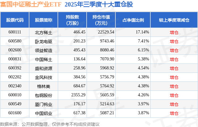 从基金规模来看,富国中证稀土产业ETF基金2025年三季度公布的基金规模为13.15亿元,较上一期规模3.65亿元变化了9.5亿元,环比变化了260.17%。该基金最新一期资产配置为:股票占净值比99.3%,无债券类资产,现金占净值比1.23%。从基金持仓来看,该基金当季前十大股票仓位达61.48%,第一大重仓股为北方稀土(600111),持仓占比为17.14%。